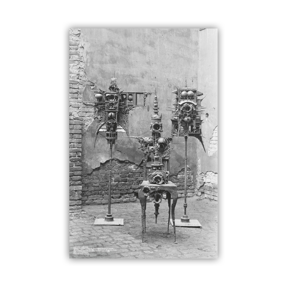 ALEŠ VESELÝ (1935–2015): Objekty Aleše Veselého (Enigma III, Usurpátor a Enigma IV) na dvoře žižkovského ateliéru / Aleš Veselý's works (Enigma III, Usurper Chair, and Enigma IV) in the courtyard of his Žižkov studio. Kolem roku 1964 / ca. 1964. Foto / photo Jan Svoboda